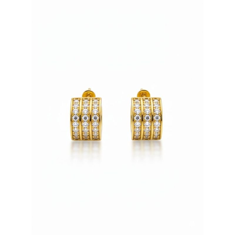 Para quem busca impacto e brilho máximo, o Brinco Bold Triple é a escolha definitiva. Este modelo de design robusto apresenta três fileiras paralelas de zircônia meticulosamente cravadas, criando uma parede de luz continua que envolve a orelha com sofisticação.