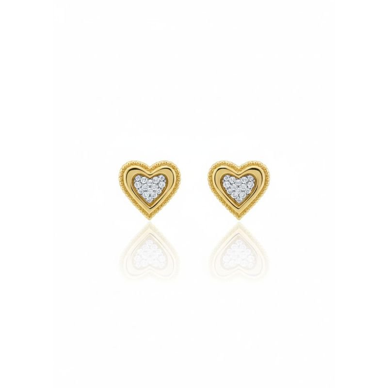 O Brinco Heart Royal redefine o romantismo com uma estética rica e imponente. Este modelo apresenta um design de coração em camadas, onde um centro delicadamente cravejado em pavê de zircônias é emoldurado por uma borda de ouro polido e um acabamento externo em técnica de granulação (milgrain).